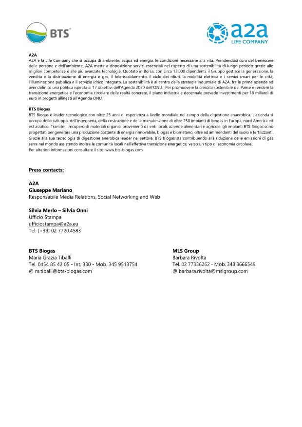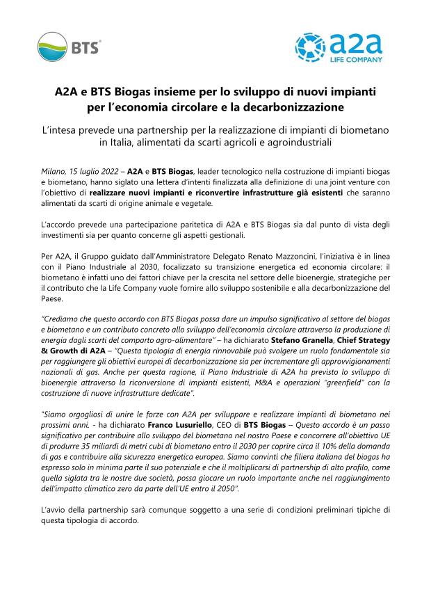 A2A e BTS Biogas insieme per sviluppo nuovi impianti economia circolare