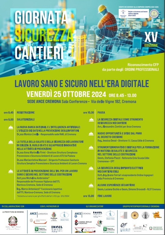Si è conclusa oggi, presso la sede di ANCE Cremona, la quindicesima edizione della "Giornata Sicurezza Cantieri", un appuntamento annuale volto a promuovere la cultura della sicurezza nei cantieri e l'innovazione nelle metodologie di prevenzione degli infortuni nel settore edile. Il tema principale di quest'anno è stato “Lavoro Sano e Sicuro nell’Era Digitale”, con un focus sugli strumenti digitali e sull'utilizzo dei dati per garantire condizioni lavorative più sicure ed efficienti. L’iniziativa, nata nel 2010, vede l’affiatata collaborazione tra Associazione Costruttori ANCE Cremona egli Ordini Professionali (Architetti, Ingegneri, Geometri, Periti Industriali) della Provincia di Cremona, in collaborazione con Ance Lombardia, INAIL Cremona, ATS Val Padana, Ispettorato Territoriale del Lavoro di Mantova-Cremona, Ente Scuola Edile Cremonese-C.P.T., Cassa Edile di Cremona, R.L.S.T Cremona e quest’anno ha ottenuto il Patrocinio della Prefettura di Cremona, del Comune di Cremona, della Camera di Commercio di Cremona , della Direzione Regionale Lombardia INAIL, dell’ATS Val Padana, dell’Ispettorato Nazionale del Lavoro e di Ance Lombardia. Partecipanti all’evento 170, tra cui imprenditori e dipendenti del settore delle costruzioni, tecnici comunali e di pubbliche amministrazioni e liberi professionisti, funzionari ATS, Coordinatori sicurezza cantieri e operatori del Sindacato che hanno seguito i lavori in presenza. Gli Ordini Professionali hanno riconosciuto ai propri iscritti i crediti formativi e grazie alla collaborazione della Scuola Edile Cremonese – C.P.T., la partecipazione alla giornata formativa è stata valevole quale Aggiornamento Coordinatori Sicurezza e RSPP (crediti riconosciuti 4 ore). Il Presidente di Ance Cremona, Carlo Paolo Beltrami ha colto l’occasione per ringraziare tutti gli Enti che collaborano alla realizzazione di questo significativo evento e ha sottolineato che ANCE Cremona mantiene il suo impegno per la promozione della sicurezza e dell'innovazione nel settore, continuando a essere un punto di riferimento per le imprese del territorio anche attraverso l’adozione del Codice di Condotta volontario denominato CIS CANTIERE IMPATTO SOSTENIBILE che prevede la messa in atto di comportamenti orientati alla decarbonizzazione, tutela dell’ambiente in un’ottica di economia circolare, legalità, regolarità contrattuale nei rapporti di lavoro, sicurezza e prevenzione della salute dei lavoratori. L’evento è stato moderato dal Direttore di Ance Cremona, Arch. Laura Maria Secchi, che ha ricordato che la sicurezza del cantiere è legata anche alla Patente a Crediti: “Questa PATENTE non deve essere vista come un limite all’attività del cantiere edile, bensì uno strumento di stimolo e sollecitazione all’imprenditore ed al lavoratore autonomo affinché ogni giorno applichino la sicurezza anche nei cantieri di modesta entità e proseguano la formazione in modo continuativo, partecipando ai corsi di aggiornamento presso Enti accreditati : la formazione per la sicurezza non è un costo è un dovere di imprese e lavoratori”.