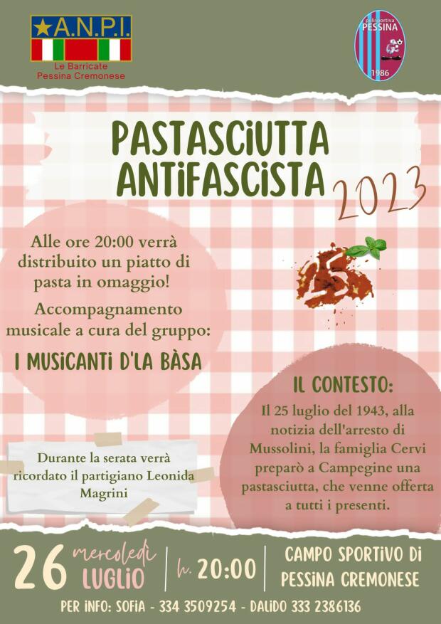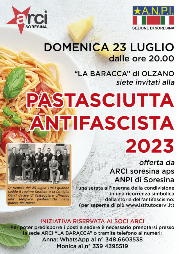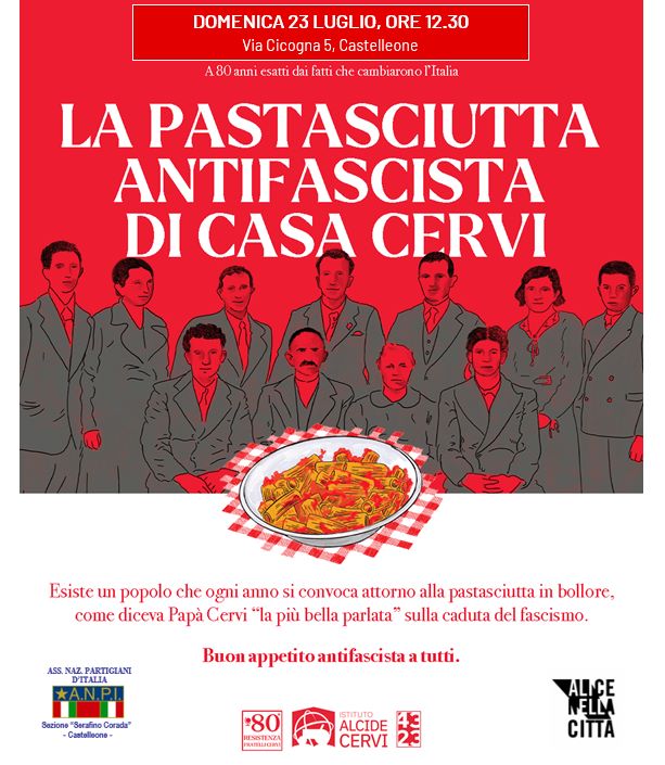 Martedì 25 luglio 2023 a Casa Cervi a Gattatico (Reggio Emilia) torna la storica Pastasciutta Antifascista, la Festa celebrata all’aperto nel Parco “ai Campirossi” nata grazie alla Famiglia Cervi, che festeggiò la destituzione e l’arresto di Benito Mussolini, avvenuti il 25 luglio 1943, offrendo la pastasciutta a tutti i presenti nella piazza della vicina Campegine. Il 2023 è un anno speciale: sono trascorsi 80 anni dall’inizio della Resistenza italiana e dalla storica Pastasciutta dei Cervi.