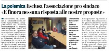 All’appuntamento con l’assessore Simona Pasquali e il dirigente Marco Pagliarini, infatti, non sono stati invitati i rappresentanti dell’associazione Passione per Cremona, che ha sostenuto la candidatura di Gianluca Galimberti alle elezioni».