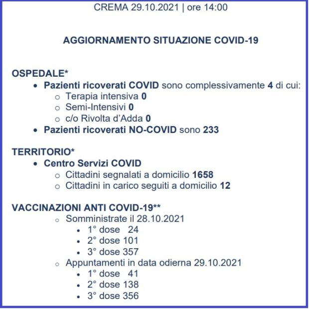 Asst Crema aggiornamento dati Covid-19 al 29 ottobre 2021