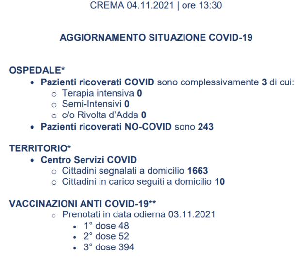 Asst Crema Aggiornamento dati Covid-19 al 4 novembre 2021