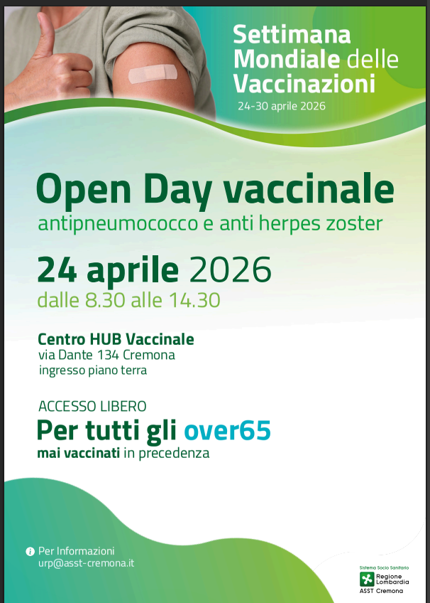 In occasione della Settimana Mondiale delle Vaccinazioni promossa dall’Organizzazione Mondiale della Salute in programma dal 24 al 30 aprile 2026, l’ASST di Cremona organizza un open day vaccinale dedicato agli over 65 per prevenzione due infezioni particolarmente frequenti e potenzialmente gravi: pneumococco e herpes zoster.