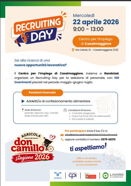 Attive 143 offerte lavoro CPI 21/04/2026 Cremona,Crema,Soresina e Casal.ggiore