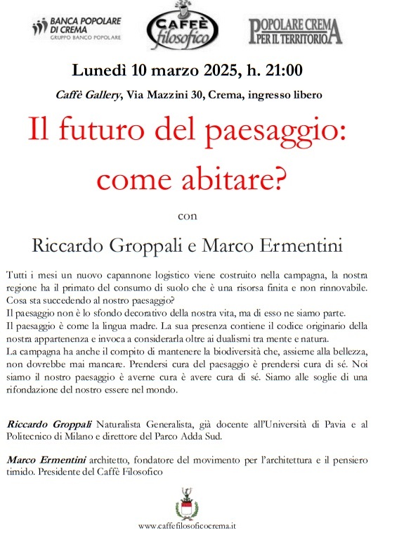 Lunedì 10 marzo alle 21 ci sarà il consueto incontro del Caffè Filosofico a Crema presso il Caffè Gallery, interverranno Riccardo Groppali e Marco Ermentini su:Il futuro del paesaggio: come abitare?