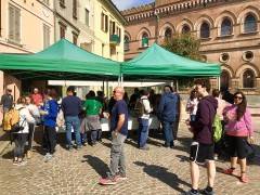 Il gazebo in piazza Garibaldi al mattino, in occasione del mercato, una chiacchierata informale finita con un caffè al bar al pomeriggio a Casalbellotto.
