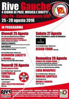 Anche quest’anno il circolo Rive Gauche di PRC di Casalmaggiore organizza , presso il Lido PO , dal 25 al 28 agosto 2016 la festa intitolala ‘ 4 giorni di pace, musica e diritti. Ospite d’eccezione LIDIA MENAPACE con una serata dedicata alle donne.