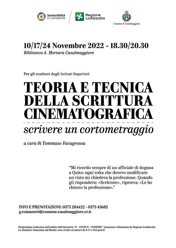 Casalmaggiore Corso gratuito di scrittura cinematografica Teoria e tecnica della scrittura cinematografica Giovedì 03 Novembre 2022 2022-11-03T12:28:00+01:00 | Scritto da Redazione Casalmaggiore Corso gratuito di scrittura cinematografica 755 visite Articoli correlati Mercoledì 02 Novembre 2022 Teatro Casalmaggiore I due gemelli veneziani di Carlo Goldoni Mercoledì 02 Novembre 2022 BRESCIA PARMA: BRUCIA IL TRENO (VECCHIO) A CASALMAGGIORE PASSEGGERI FERMI 2 ORE | Dario Balotta Martedì 01 Novembre 2022 Casalmaggiore La Via Colombo ritorni ad essere intitolata a Francisco Ferrer| G.Azzoni. Martedì 01 Novembre 2022 Festa del Ringraziamento con il Vescovo a Casalmaggiore Lunedì 17 Ottobre 2022 Teatro Casalmaggiore Con 'Finale di partita' e 'Diario dei giorni felici' Domenica 16 Ottobre 2022 La staffetta ambiente Rete Ambiente Lombardia ha fatto tappa a Casalmaggiore Sabato 15 Ottobre 2022 Casalmaggiore Amici del Po presentano il libro 'Alieni' di Davide Persico