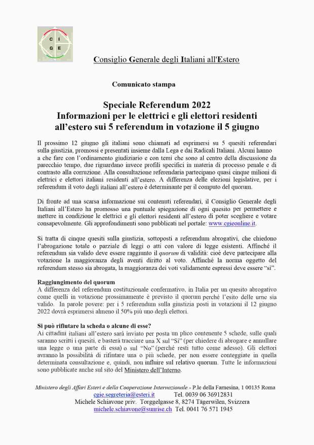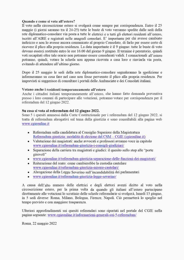 Informazioni per le elettrici e gli elettori residenti all’estero sui 5 referendum in votazione il 5 giugno