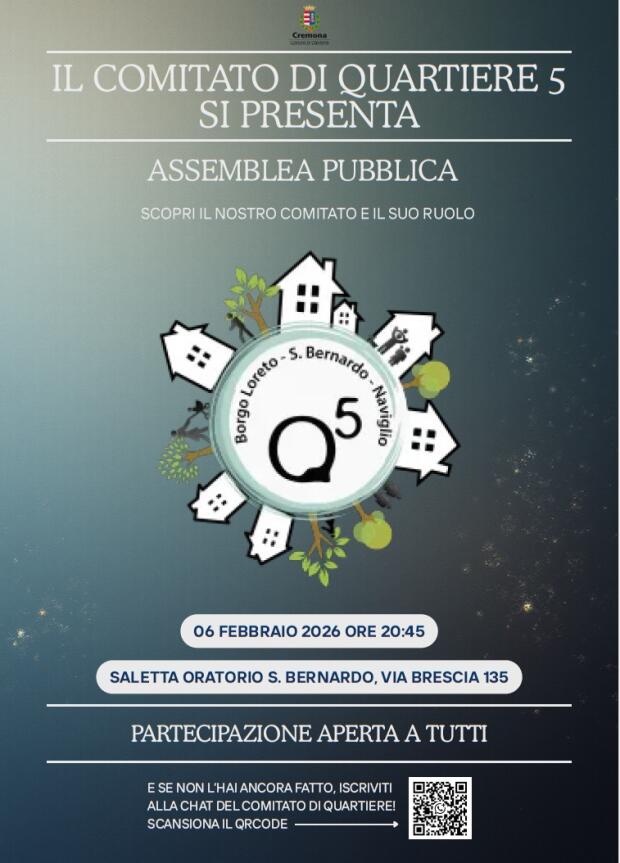 Gentilissimi residenti del Q5 (San Bernardo - Borgo Loreto - Naviglio - Fazioli), IL COMITATO DI QUARTIERE 5 è lieto di invitarvi all'Assemblea pubblica di VENERDI' 6 FEBBRAIO alle ore 20.45, che terremo presso il salone dell'Oratorio di San Bernardo (P.T.) Riteniamo sia un utile momento di confronto e condivisione dei vari aspetti che riguardano per l'appunto il nostro Quartiere e la nostra Comunità. Vi aspettiamo numerosi ! Grazie
