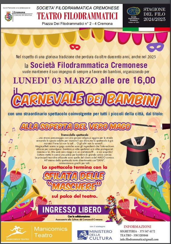 Nel rispetto della tradizione anche quest'anno si svolgerà il CARNEVALE DEI BAMBINI presso il Teatro Filodrammatici, lunedì 3 Marzo 2025 alle ore 16, ingresso libero.