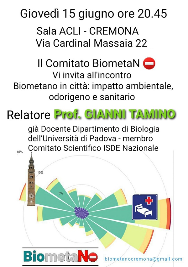 Il Comitato BiometaNO Cremona ha organizzato per il prossimo giovedì 15 giugno 2023 l’incontro pubblico dal titolo “Biometano in città: impatto ambientale, odorigeno e sanitario”. Relatore della serata, che si terrà presso la sala ACLI di via Cardinal Massaia a Cremona, sarà il Prof. Gianni Tamino, già docente di biologia presso l'Università di Padova e membro del Comitato Scientifico ISDE (Associazione Italiana Medici per l’Ambiente). L’evento è stato promosso in queste settimane sia tramite i canali social del Comitato che mediante un’intensa attività di volantinaggio porta a porta ad opera di numerosi volontari che si sono mobilitati in tutta la città.