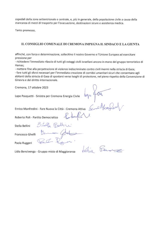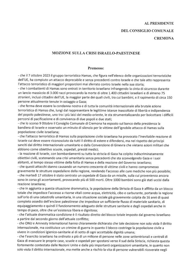 Mozione depositata all'Ufficio Protocollo del Comune di Cremona, condivisa con gli altri gruppi e consiglieri di maggioranza, sulla grave crisi umanitaria a Gaza in conseguenza della reazione dell'esercito israeliano all'attacco terroristico di Hamas contro Israele, che sarà discussa auspicabilmente nel prossimo consiglio Comunale.