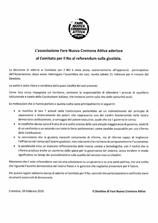 Cremona L'associazione Fare Nuova Cremona Attiva si schiera per il NO al Referendum sulla Giustizia