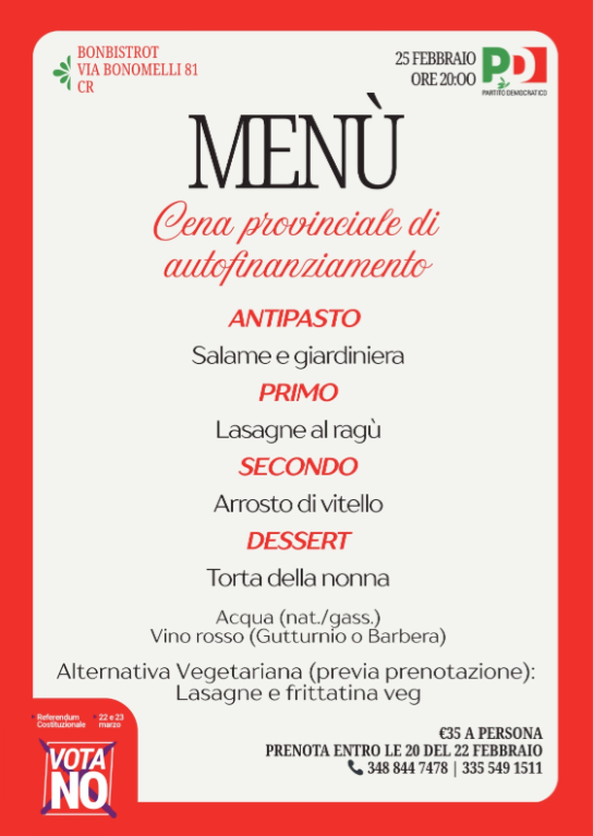 (CR) Il PD organizza una cena di autofinanziamento per il NO al Referendum Giustizia
