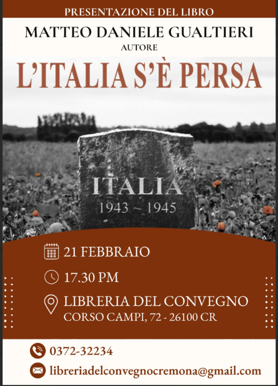 Sabato 21 febbraio alle ore 17.30 presentiamo il libro di Matteo Daniele Gualtieri, "L'Italia s'è persa", Italia, marzo 1945. La Seconda Guerra Mondiale è ormai agli sgoccioli. A Pontepiana, piccolo paese perso tra le colline fuori Milano, Carlo Rigomonti, maresciallo-capo della Repubblica Sociale Italiana, è chiamato a indagare su un luogo del crimine che ricalca alla perfezione il modus operandi della Banda Mameli, un gruppo di eversivi talmente fuori controllo da non essere riconosciuto neanche dai ranghi ufficiali della Resistenza. Per Carlo, la comparsa della Banda Mameli è l’ennesima sfida di un conflitto che sta mettendo a dura prova il suo stesso credo. Sentimento che sta provando anche Danilo, detto Morino, diviso tra il desiderio di vendetta per ciò che il regime fascista gli ha portato via, e la paura di perdere la propria umanità in nome di un bene superiore. Due uomini più simili di quanto possano immaginare, legati da una guerra fratricida e l’ultimo incombente atto di forza di Mazzini, il misterioso leader della Banda Mameli.