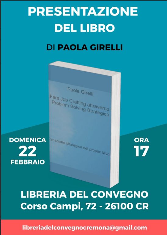 Domenica 22 febbraio presentiamo il libro di Paola Girelli, "Fare Job Crafting attarerso Problem Solving Strategico", Il testo e la sintesi dello studio di due modelli che ritengo essenziali per costruire attivamente il proprio percorso professionale e la propria identità. La ricerca degli ultimi vent'anni ha dimostrato la loro efficacia confermandone le potenzialita. Gli argomenti affrontati, senza la pretesa di essere esaustivi, offrono un' introduzione ai principi teorici ed operativi utili a chi vuole cambiare e migliorare il proprio progetto di carriera.