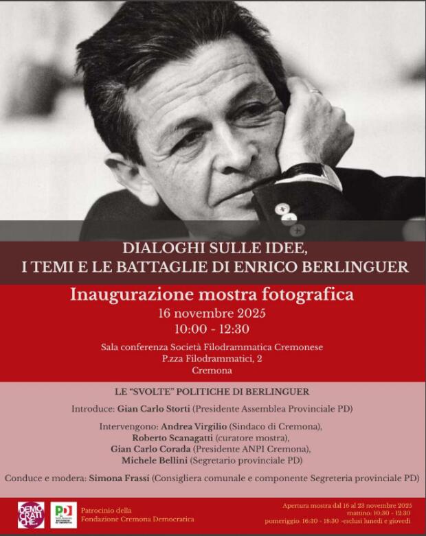 Cremona, dal 16 al 23 novembre 2025, ospita una mostra fotografica dedicata alla vita, alla carriera e al lascito morale del dirigente del Partito Comunista Italiano.