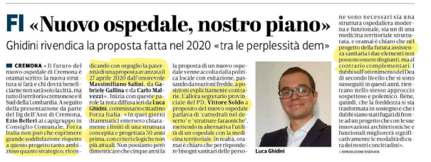 Sig. Direttore Mi permetta di fare alcune considerazioni, su un articolo apparso sul quotidiano La Provincia, in merito alle sperticate lodi che fa del suo partito il Sig. Luca Ghidini commissario cittadino di Forza Italia in merito alla paternità del “nuovo ospedale di Cremona” e della sua convinzione che “il futuro dell’ospedale è ormai scritto”.