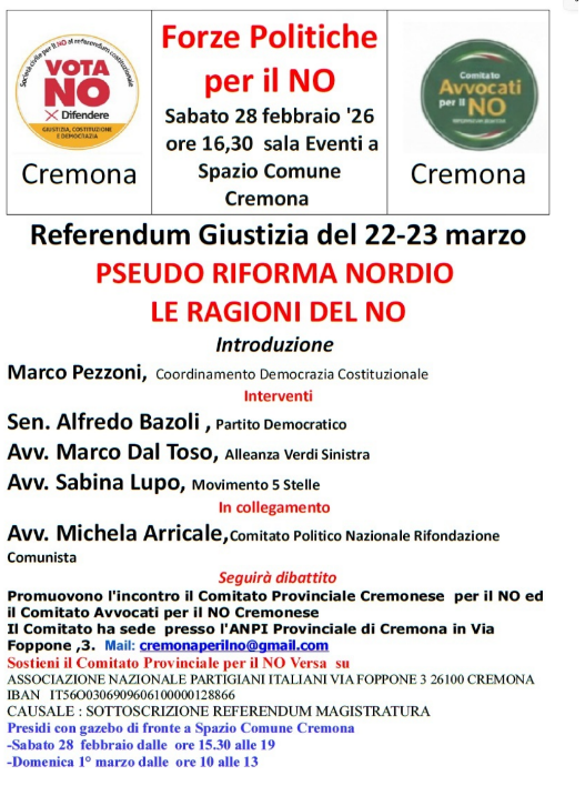 (CR) Referendum Incontro con Le forze politiche per NO: PD,M5S,AVS e Rifondazione