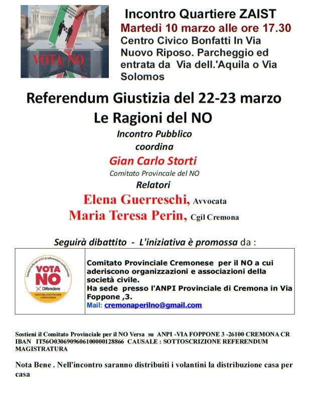 (CR) Referendum Le ragioni del NO Incontro allo Zaist il 10 marzo