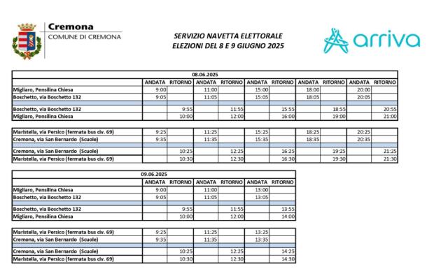 Gli elettori che intendano esercitare il diritto di voto, ma impossibilitati a recarsi al seggio autonomamente a causa di impedimento motorio, possono chiedere di essere accompagnati al seggio con servizio di trasporto effettuato da associazione provvista di automezzi attrezzati per il trasporto di persone disabili. Per usufruire del servizio di trasporto basta telefonare in tempo utile all'Ufficio Elettorale del Comune (tel. 0372407333 - 0372407332).