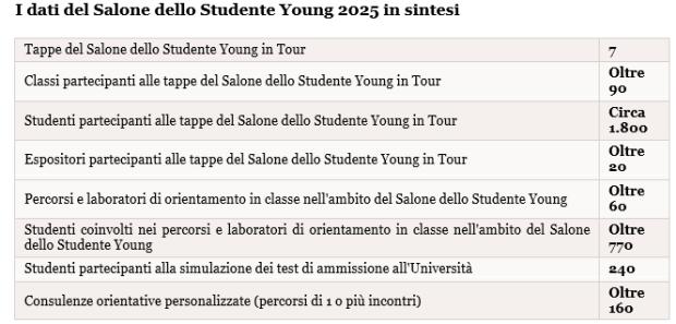 “Il Salone dello Studente Young 2025 – commenta Maria Carmen Russo, responsabile del Servizio Informagiovani – si chiude con un esito positivo a conferma dell’apprezzamento per un percorso che ha messo i ragazzi e le loro esigenze in primo piano, offrendo loro strumenti concreti per orientarsi tra le scelte formative e professionali. La partecipazione attiva di studenti, scuole e rappresentanti del mondo accademico, della formazione e del lavoro dimostra quanto sia fondamentale creare spazi di confronto e supporto dedicati all’orientamento. L’impegno dell’Informagiovani, però, non si esaurisce con questa manifestazione: ogni giorno i nostri esperti sono a disposizione per colloqui individuali, percorsi di orientamento, ri-orientamento e attività nelle scuole, con l’obiettivo di aiutare i ragazzi a costruire con consapevolezza il proprio futuro”.