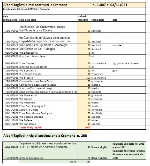 Sotto la Tabella diffusa, in settembre, dall'assessorato al Verde del Comune di Cremona del taglio degli alberi. In ogni caso quelli ripiantumati saranno circa 190 in quanto verranno sostituiti anche una 50ina di alberi seccati