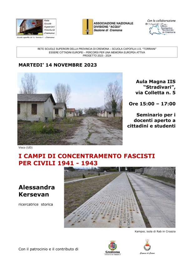 Il progetto 2023-2024 intende approfondire con seminari ed incontri il ruolo del fascismo nell’occupazione della Jugoslavia nel 1941, riproponendo il tema, a lungo ignorato, dei numerosi campi fascisti per militari e civili nel territorio del Regno d’Italia e nelle province annesse (in particolare il campo di Gonars, in provincia di Udine) e l’abbattimento dei confini tra la Repubblica Italiana e la Slovenia nel processo di creazione dell’Europa Unita.