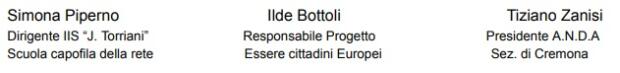 Lo scorso 9 novembre 2023, nella Presidenza dell'Istituto Torriani di Cremona , sono intreveniti alla conferenza stama: Marzia Catelli collaboratrice realizzazione del progetto, Fabio Donati in rappresentanza dell'UST , Ilde Bottoli responsabile progetto Cittadini Europei e Simona Piperno dirigente IIS J.Toriani scuola capofila della rete.