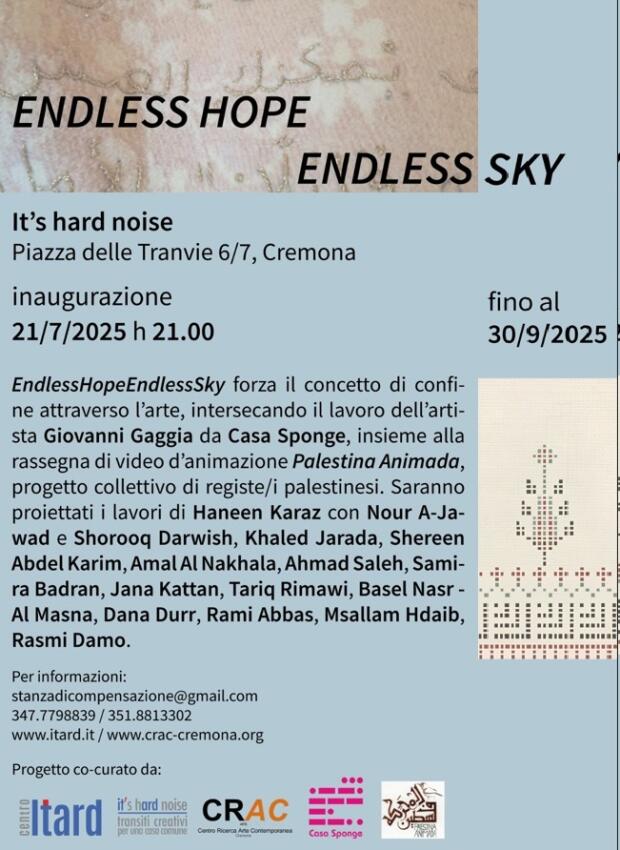 Lunedì 21 luglio alle ore 21.00, lo spazio di It’s hard noise di Cremona, in Piazza delle Tranvie 6/7, inaugura EndlessHopeEndlessSky, esposizione che accoglie due interventi paralleli e allo stesso tempo interrelati da precisi intenti, tematiche e urgenze. Un raccordo di più voci accomunate dal desiderio di intessere attraverso l’arte, una rete di resistenza concreta per la Palestina oltre i confini fisici e geografici.