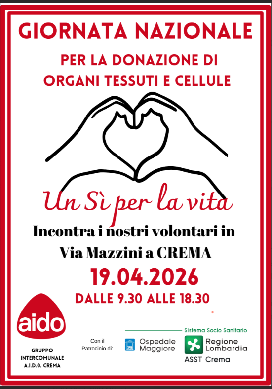 Il 19 aprile 2026 in occasione della "Giornata nazionale della Donazione di Organi Tessuti e Cellule" promossa dal Ministero della Salute, il Gruppo Intercomunale AIDO Crema, con l’importante collaborazione di ASST Crema, darà il proprio contributo all’iniziativa.