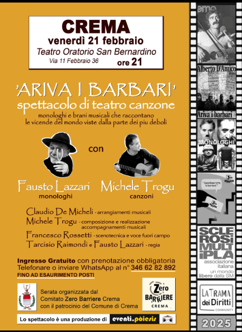 Con la sala gremita del Teatro dell’Oratorio di San Bernardino e un pubblico profondamente coinvolto, lo spettacolo “Ariva i Barbari” ha conquistato i presenti offrendo non solo intrattenimento ma un'importante occasione di riflessione e crescita collettiva. Organizzato dal Comitato Zero Barriere, patrocinato dal Comune di Crema e inserito nella Trama dei Diritti di CSV Lombardia Sud, l'evento ha saputo stimolare l’attenzione su temi sociali di grande attualità.