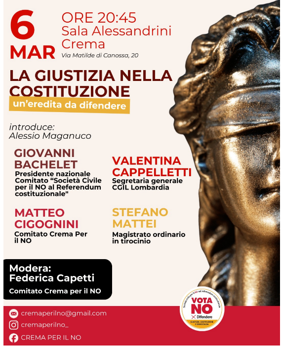 La giustizia nella Costituzione Martedì 6 marzo ore 20,45 Sala Alessandrini Crema