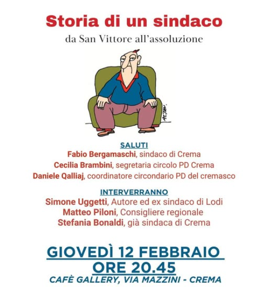 Il Partito Democratico di Crema organizza un incontro pubblico per la presentazione del libro “Storia di un Sindaco” dell'ex primo cittadino di Lodi Simone Uggetti. Appuntamento per la serata di giovedì 12 febbraio 2026 alle ore 20,45 presso il Caffè Gallery di Crema, in Via Mazzini. Oltre all’autore del libro saranno presenti Fabio Bergamaschi (sindaco di Crema), Cecilia Brambini (segretaria cittadina PD Crema), Daniele Qalliaj (coordinatore territoriale PD Cremasco), Matteo Piloni (consigliere regionale PD) e Stefania Bonaldi (segreteria nazionale PD).
