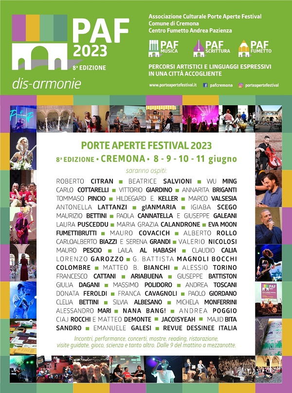 Cremona, 24 maggio 2023 - L’Associazione Culturale Porte Aperte, unitamente al Centro Fumetto Andrea Pazienza, al Comune di Cremona e al gruppo dei curatori, è lieta di presentare l’ottava edizione del PAF - PorteAperte Festival che si terrà a Cremona dall’8 all’11 giugno 2023.