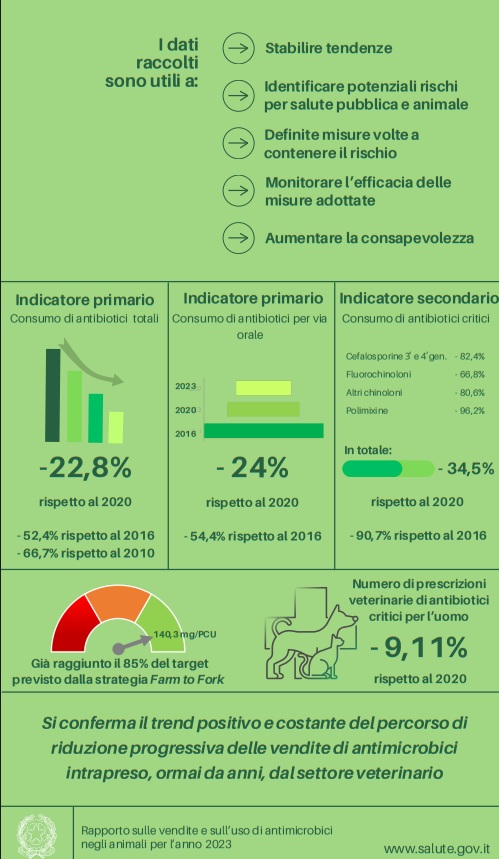 Queste percentuali di riduzione partono dal 2016, l'anno di riferimento del Piano Nazionale Contro l’Antimicrobico-Resistenza e confermano la determinazione della Veterinaria italiana nel fare un uso sempre più razionale degli antibiotici, per contrastare l’antimicrobico-resistenza, tutelando nel contempo la sanità animale.