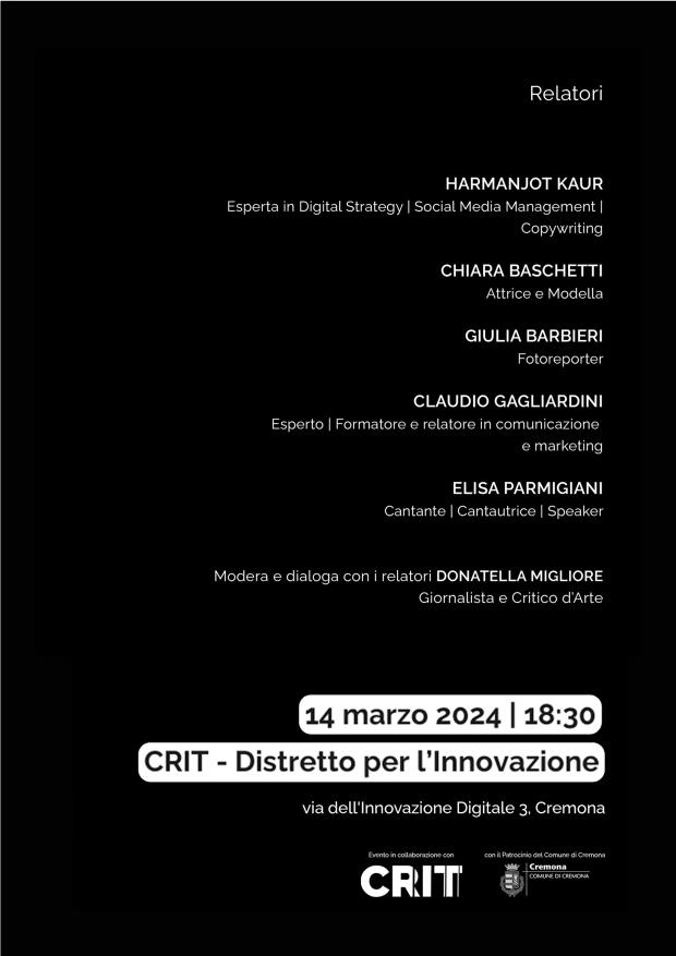 I relatori, esperti in diversi settori, hanno condiviso la necessità di sensibilizzare, offrire spunti di riflessione e strumenti concreti per migliorare il rapporto con il digitale, la Rete e i social network. Gli approfondimenti saranno curati da Harmanjot Kaur (digital strategist, Social Media Manager, copywriter), Chiara Baschetti (modella e attrice), Giulia Barbieri (fotoreporter), Claudio Gagliardini (formatore e relatore in comunicazione e marketing), Elisa Parmigiani (cantante, cantautrice, speaker).