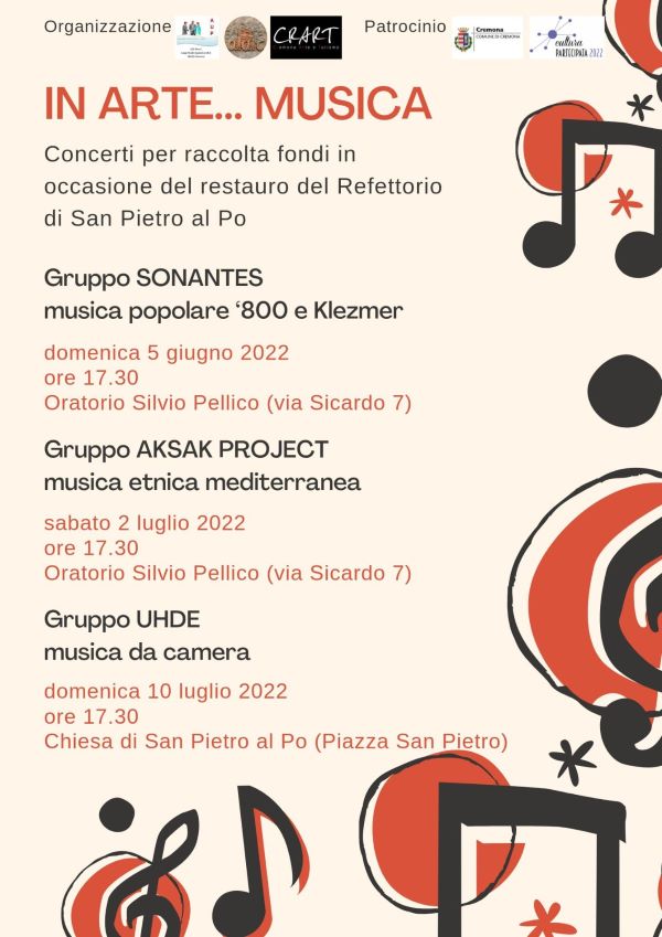 Domenica 5 giugno 2022 ore 17,30 presso oratorio Silvio Pellico in via Sicardo 7 Cremona parte la rassegna di tre concerti dedicati al restauro del “Refettorio” di San Pietro al Po.