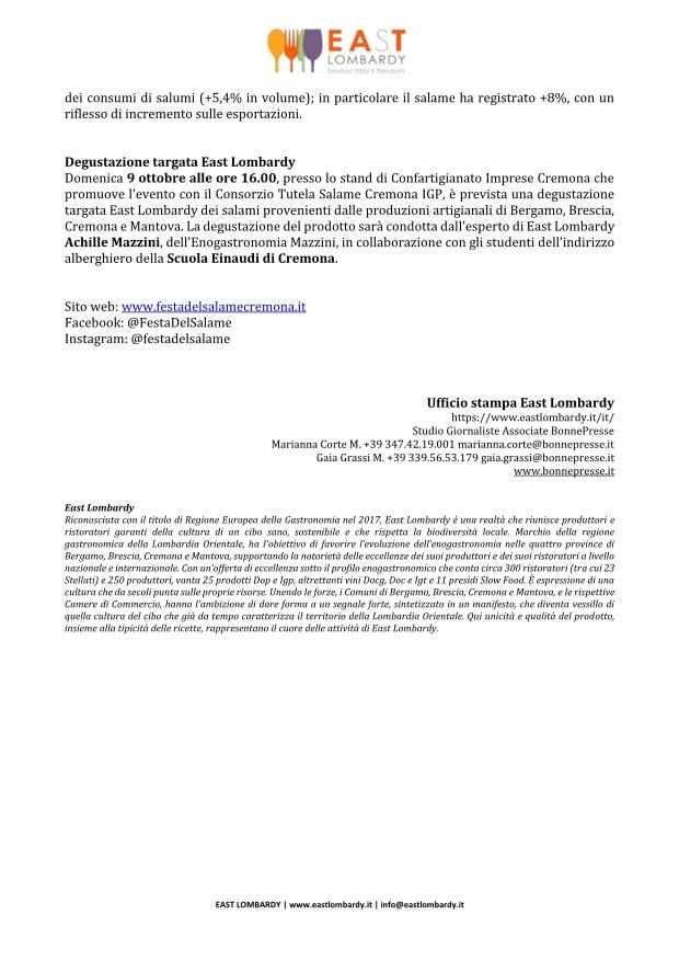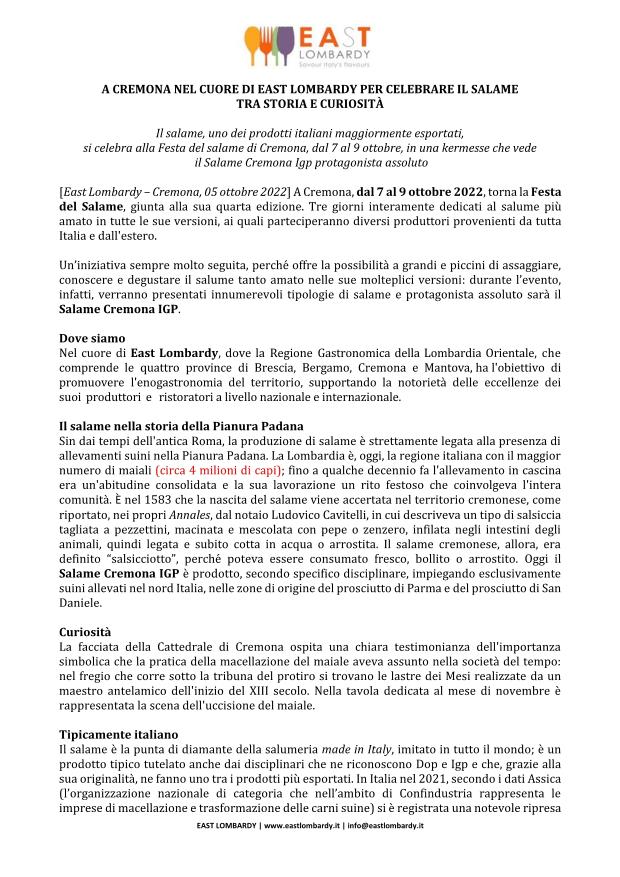 Festa del salame di Cremona, dal 7 al 9 ottobre, in una kermesse che vede il Salame Igp protagonista assoluto