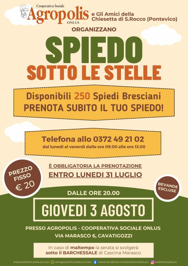 Giovedì 3 agosto torna lo “Spiedo sotto le Stelle” sull’aia di Agropolis, con la collaborazione degli Amici della Chiesetta di San Rocco di Pontevico. A partire dalle ore 20.00 verrà servito il tradizionale spiedo bresciano presso Cascina Marasco, in Via Marasco 6 a Cremona, con un piacevole accompagnamento musicale a fare da sfondo. Prenotazione obbligatoria entro il 31 luglio da lunedì a venerdì dalle 9.00 alle 13.00 al n. 0372 492102.
