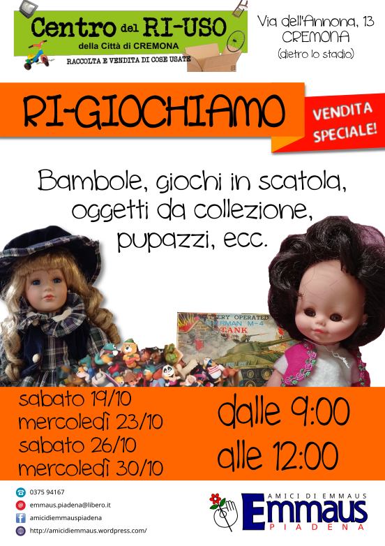 A partire da sabato 19 ottobre e fino alla fine del mese il Centro del Riuso di Cremona (Via dell'Annona, 11) ospiterà "Ri-giochiamo", una vendita speciale solidale di bambole, giochi in scatola, oggetti da collezione, pupazzi, ecc. Tutto il materiale, proveniente dalle raccolte effettuate da Emmaus, è stato accuratamente selezionato e accantonato dai volontari per questa occasione. Come sempre, tutto il ricavato verrà destinato alla Comunità Emmaus di Canove de' Biazzi.