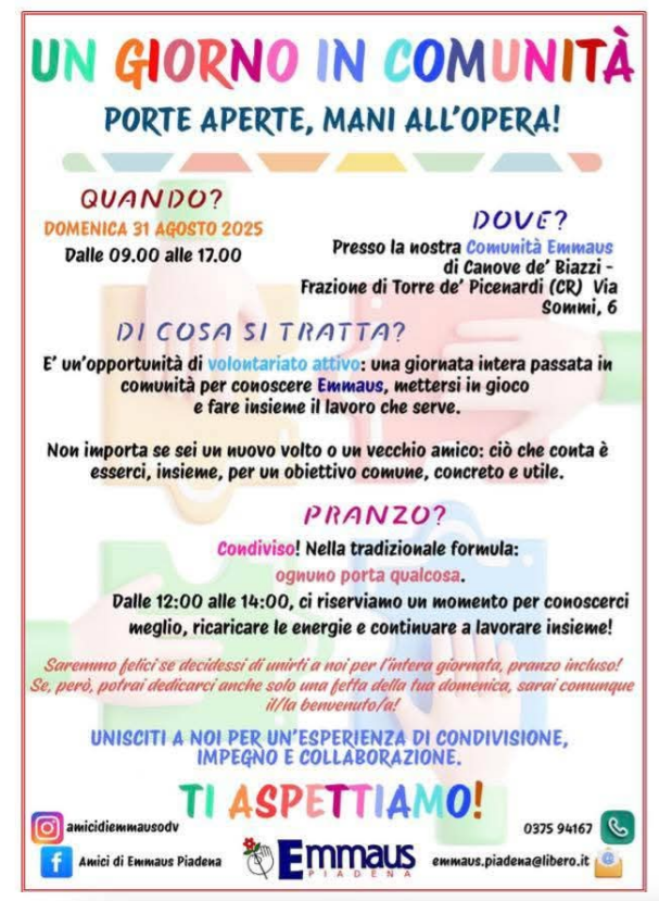 Ti offriamo la possibilità di condividere con noi una giornata all’interno della Comunità Emmaus di Canove de’ Biazzi. Avremo modo di parlare, ma soprattutto, com’è nello stile della nostra Associazione, di lavorare insieme. Non solo il tempo, le idee e il lavoro saranno condivisi, anche il pranzo lo sarà; se desideri fermarti con noi, porta qualcosa da condividere.