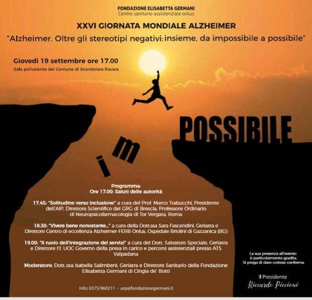 Saranno questi alcuni dei temi che verranno affrontati il 19 settembre al convegno aperto alla cittadinanza e gratuito dal titolo: “Alzheimer. Oltre gli stereotipi negativi: insieme, da impossibile a possibile”, che si terrà presso la Sala Polivalente di Scandolara Ravara, a partire dalle ore 17. Dopo il saluto alle Autorità (Don Massimo Calvi, Vicario generale della Diocesi di Cremona, Dott. Matteo Carrara, Presidente dell’Unione Municipia, Dott. Enrico Marsella, Presidente dell’Ordine Provinciale degli Infermieri di Cremona, sig.ra Loriana Poli, Presidente dell’AIMA di Cremona) la moderatrice, dott.ssa Isabella Salimbeni, lascerà la parola al prof. Marco Trabucchi, Presidente dell’Associazione Italiana di Psicogeriatria, Direttore Scientifico del Gruppo di Ricerca Geriatrica di Brescia e Professore ordinario Cattedra di Neuropsicofarmacologia presso l’Università di Roma “Tor Vergata”. A seguire interverrà la dott.ssa Sara Fascendini, Geriatra e Primario del Centro di eccellenza per la Diagnosi e la cura della malattia di Alzheimer - FERB onlus di Gazzaniga (Bergamo). Per terminare con “Il ruolo dell’integrazione dei servizi” illustrato dal dott. Salvatore Speciale, Direttore ff dell’Unità di Governo della presa in carico e percorsi assistenziali presso ATS Val Padana.