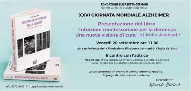 Le tra iniziative sono: 19 settembre a Scandolara Ravara convegno aperto alla cittadinanza dal titolo: “Alzheimer; Il 20 settembre presso Fondazione Germani presentazione libro Intuizioni montessoriane per la demenza. Una nuova visione di cura”; al teatro di Casalmaggiore sabato 21recital con brani tratti da Tahar Ben Jelloun e Simone de Beauvoir e con accompagnamento musicale dal titolo “Io, madre di mia madre”.