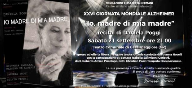 In chiusura sabato 21 settembre alle ore 21 presso il teatro Comunale di Casalmaggiore l’attrice e conduttrice televisiva Daniela Poggi sarà impegnata in un recital con brani tratti da Tahar Ben Jelloun e Simone de Beauvoir e con accompagnamento musicale dal titolo “Io, madre di mia madre”, ispirato alla sua esperienza personale con la madre affetta da Alzheimer. A seguire tavola rotonda condotta da Arianna Novelli a cui parteciperanno la dr.ssa Isabella Salimbeni Geriatra, il dr Roberto Amico Psicologo e il dr. Christian Pozzi Terapista Occupazionale. L’ingresso è ad offerta libera.