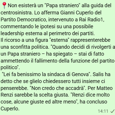 Gianni Cuperlo, che non parla a caso, fa bene a dire che la Salis debba restare a Genova dopo poco più di un anno che è stata eletta sindaco. Condivido anche il giudizio che 'quando ti decidi di rivolgerti ad un Papa straniero' ammetti il fattimento della funzione di partito politico".