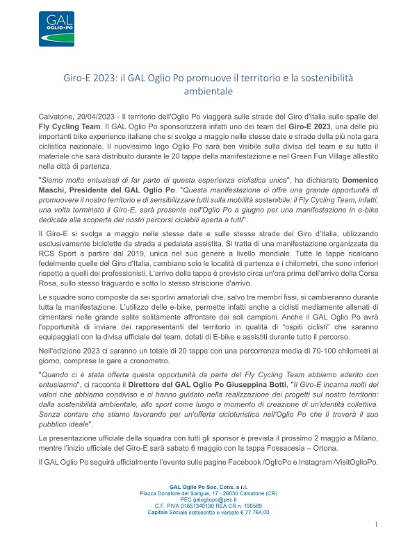 "Siamo molto entusiasti di far parte di questa esperienza ciclistica unica", ha dichiarato Domenico Maschi, Presidente del GAL Oglio Po.