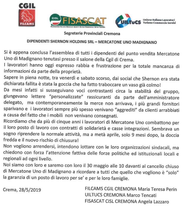Si è svolta ieri,28 maggio, l’assemblea dei lavoratori del Mercatone Uno di Madignano dei dipendenti per esaminale la situazione. Nel volantino dei sindacati leggiamo che’ i lavoratori hanno espresso rabbia e frustrazione per la totale mancanza di informazioni da parte della proprietà’.