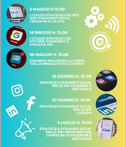 Il primo webinar dal titolo “UTILIZZO STRATEGICO DEL SITO WEB: fondamenti per la creazione di un sito web” si svolgerà il 2 maggio 2023, dalle 15.00 alle 16.00. Il primo vuole fornire una panoramica sugli strumenti che si possono utilizzare per creare un sito web aziendale da zero - da Google My Business (GMB) alle piattaforme CMS (ad esempio Wordpress, Drupal) - con un focus sull’importanza della landing page.